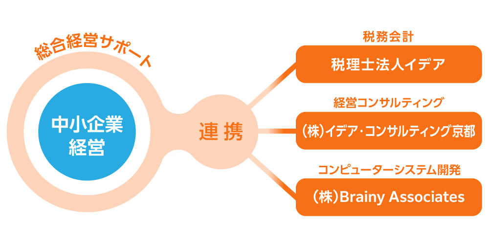 ideaグループは、税理士法人を中心に、中小企業経営の成長に欠かせないサービス連携をしてお客様に提供しています。